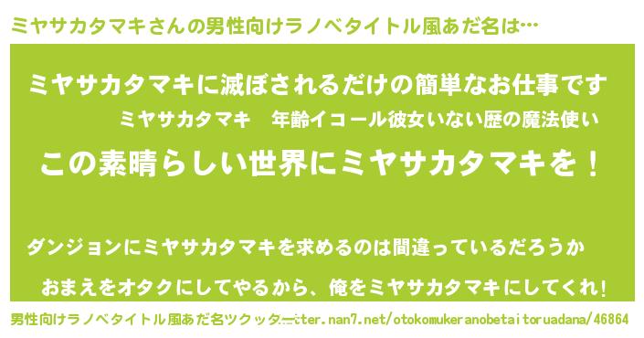| 女子向けラノベタイトル風あだ名 | 『乙女ゲームの破滅フラグしかない悪役ミヤサカタマキに転生してしまった…』 |