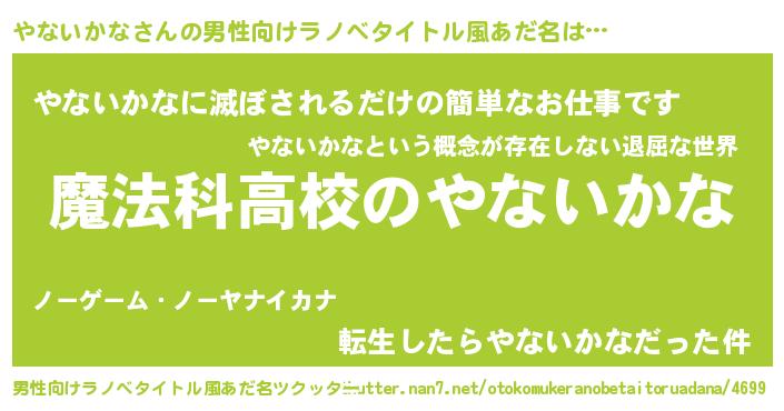 | 女子向けラノベタイトル風あだ名 | 『やないかななんてお断りですっ。』 |