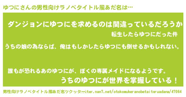 | 女子向けラノベタイトル風あだ名 | 『ゆつにの婚約者』『ゆつには平凡を望む』 |
