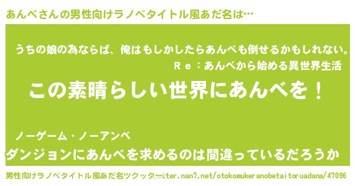 | 意味不明あだ名 | 『住所不定無職あんべ(8歳)』『自称あんべ』 |
