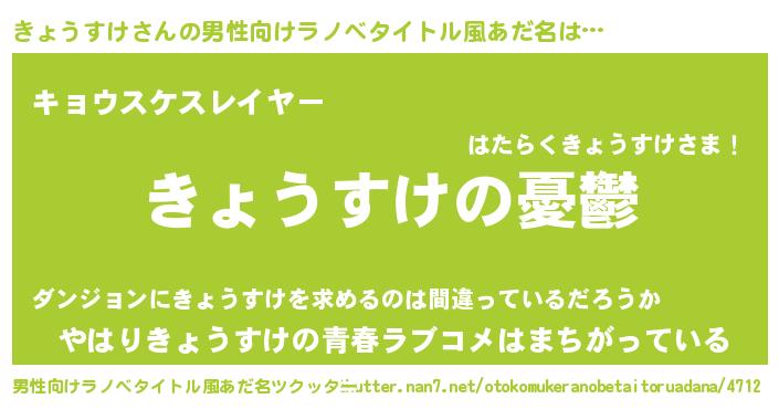 | 女子向けラノベタイトル風あだ名 | 『(仮)きょうすけのやんごとなき事情』 |