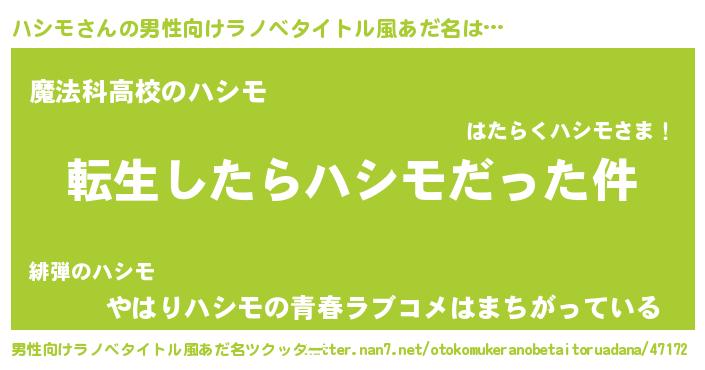 | 意味不明あだ名 | 『なめこ科ハシモ属』『自称ハシモ』 |