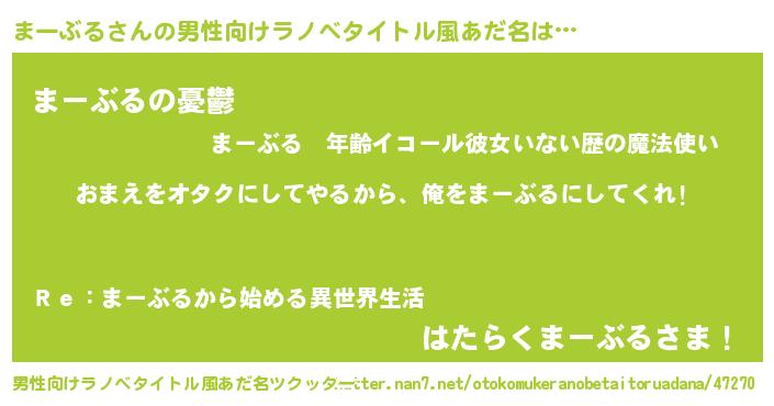 | 女子向けラノベタイトル風あだ名 | 『まーぶる夫妻のなれそめ』 |