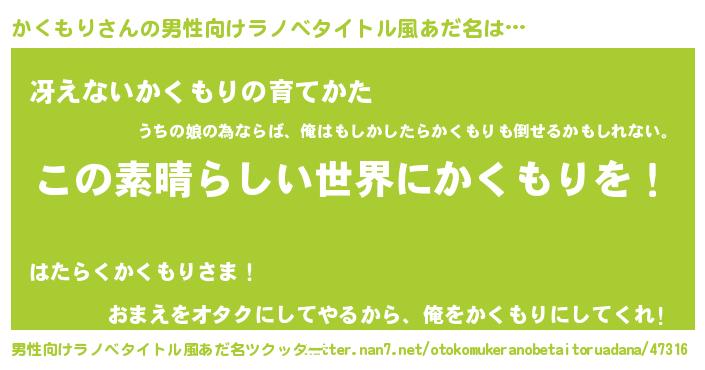 | 女子向けラノベタイトル風あだ名 | 『乙女ゲームの破滅フラグしかない悪役かくもりに転生してしまった…』 |