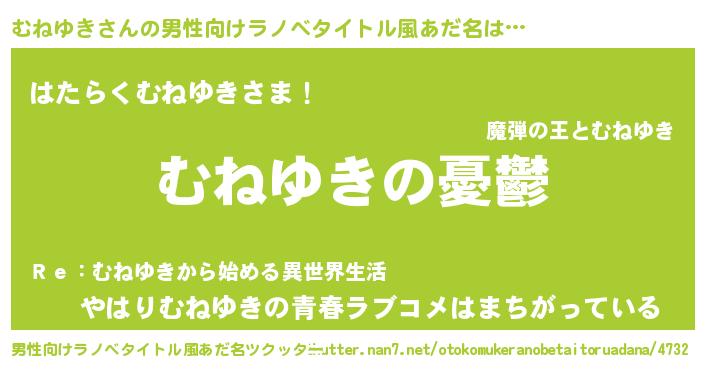 | 女子向けラノベタイトル風あだ名 | 『むねゆき姫と円卓の騎士』 |