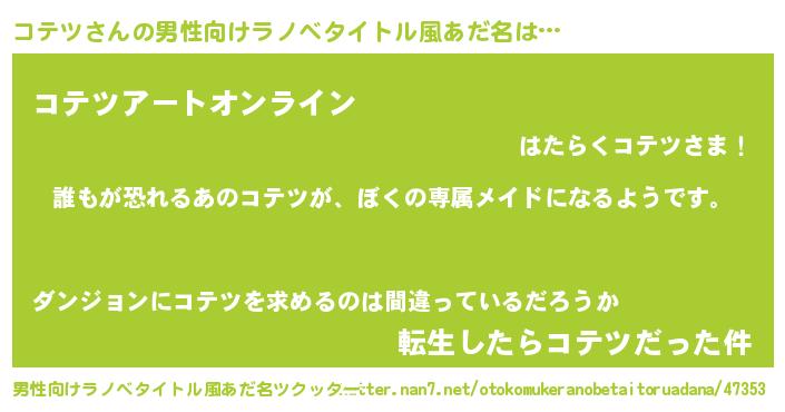 | 女子向けラノベタイトル風あだ名 | 『異世界でカフェコテツを開店しました。』 |