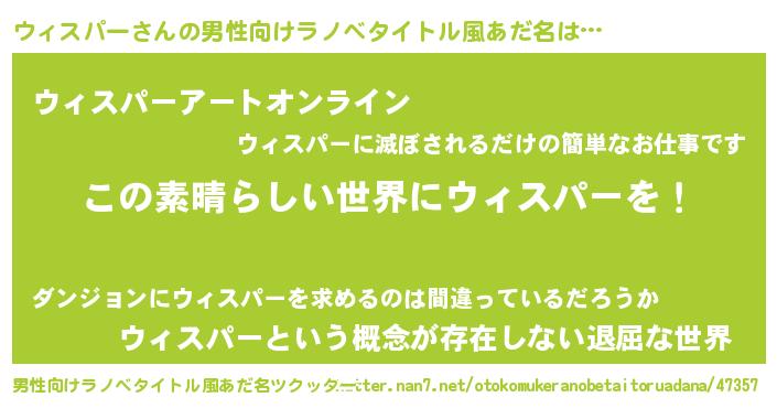 | 胡散臭い通販商品みたいなあだ名 | 『あなたにだけ特別に提供する100年もののヴィンテージワイン…その名も「ウィスパー」』 |