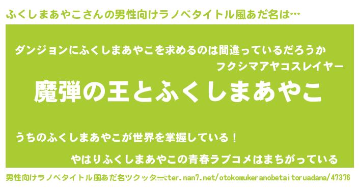 | 女子向けラノベタイトル風あだ名 | 『ふくしまあやこが死なない童話 林檎のふくしまあやこの診療簿』 |