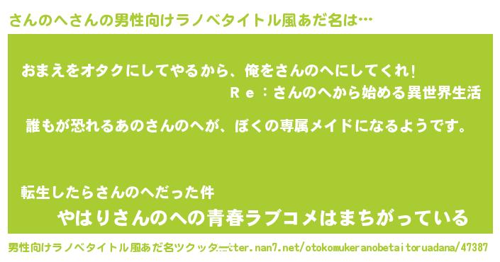 | 胡散臭い通販商品みたいなあだ名 | 『来世でも幸せになれる健康食品…その名も「さんのへ」』 |