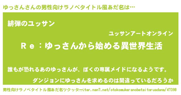 | 女子向けラノベタイトル風あだ名 | 『ゆっさんストレイドッグス』 |