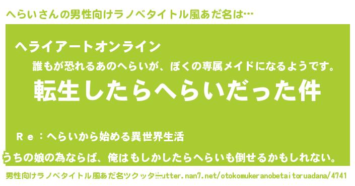 | 女子向けラノベタイトル風あだ名 | 『へらいの玉の輿計画!』『闇のへらい』 |