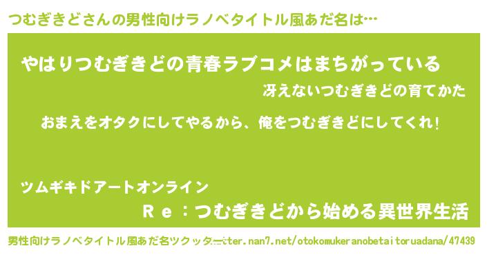 | 女子向けラノベタイトル風あだ名 | 『つむぎきど夫妻のなれそめ』 |