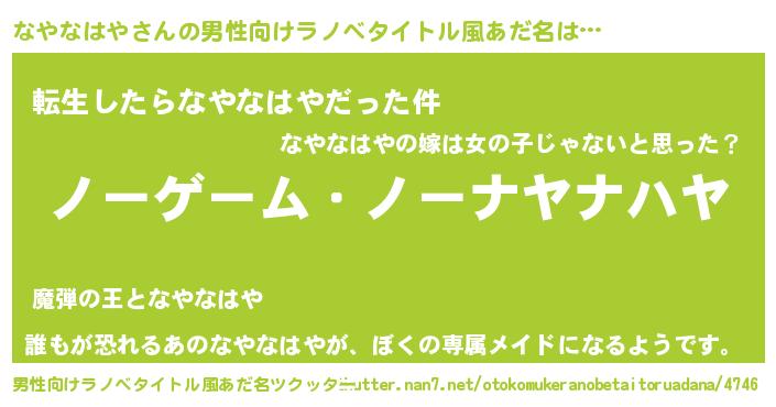 | 女子向けラノベタイトル風あだ名 | 『死神なやなはやの再婚』 |