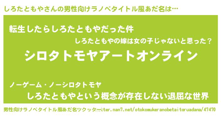 | 女子向けラノベタイトル風あだ名 | 『誰かこのしろたともやを説明してください! ~契約から始まるウェディング~』 |