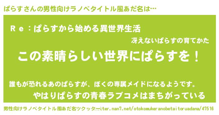 | 女子向けラノベタイトル風あだ名 | 『悪役ぱらすに転生したようですが、知った事ではありません』 |