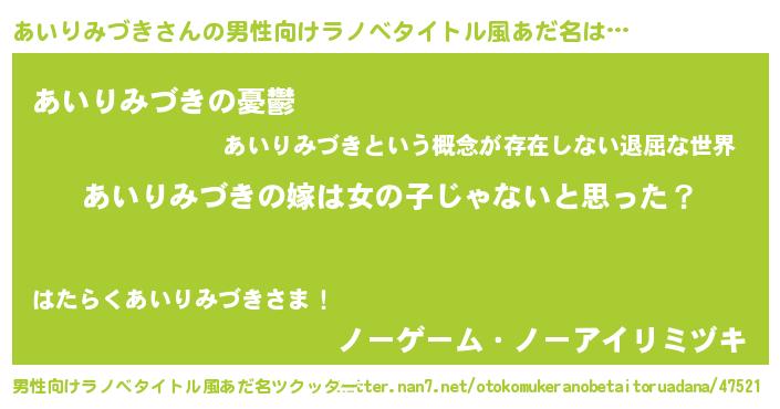 | 女子向けラノベタイトル風あだ名 | 『あいりみづきの卵を拾いまして』 |