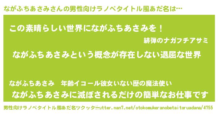 女子向けラノベタイトル風あだ名 | 『異世界で失敗しない100のながふちあさみ』 |