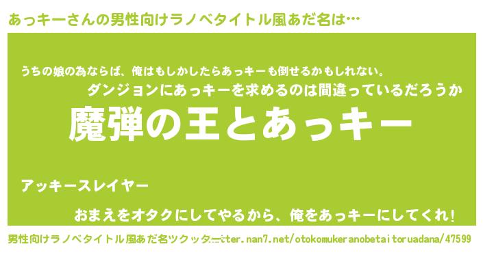 | 女子向けラノベタイトル風あだ名 | 『乙女ゲームの破滅フラグしかない悪役あっキーに転生してしまった…』 |