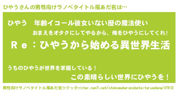 | 女子向けラノベタイトル風あだ名 | 『闇のひやう』『ひやうの玉の輿計画!』 |