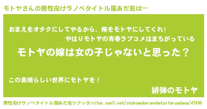 | 女子向けラノベタイトル風あだ名 | 『モトヤの卵を拾いまして』 |