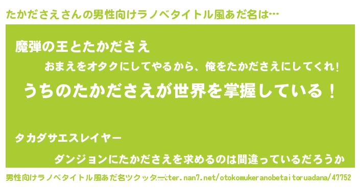 | 胡散臭い通販商品みたいなあだ名 | 『あなたにだけ特別に提供する世界で10本だけ現存している希少なブランデー…その名も「たかださえ」』 |