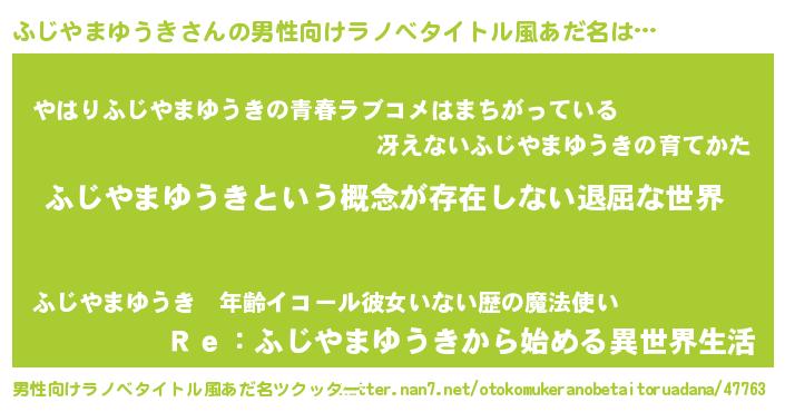 | 女子向けラノベタイトル風あだ名 | 『異世界で失敗しない100のふじやまゆうき』 |