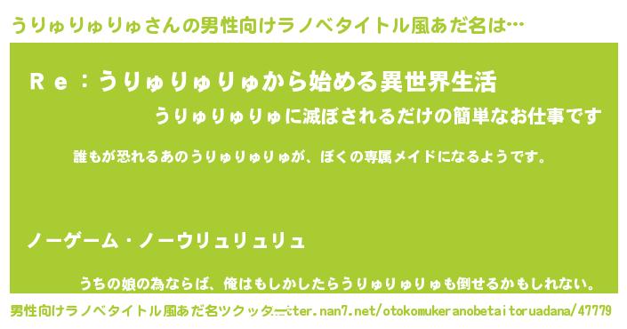 | 胡散臭い通販商品みたいなあだ名 | 『来世でも幸せになれる水素水…その名も「うりゅりゅりゅ」』 |