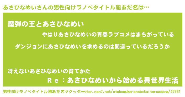| 女子向けラノベタイトル風あだ名 | 『あさひなめいは平凡を望む』 |