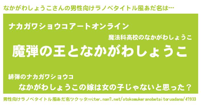 | 女子向けラノベタイトル風あだ名 | 『なかがわしょうこが死なない童話 林檎のなかがわしょうこの診療簿』 |