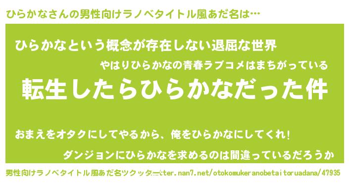 | 胡散臭い通販商品みたいなあだ名 | 『来世でも幸せになれる水素水…その名も「ひらかな」』 |