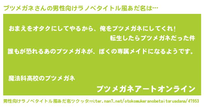 | 女子向けラノベタイトル風あだ名 | 『異世界でカフェブツメガネを開店しました。』 |