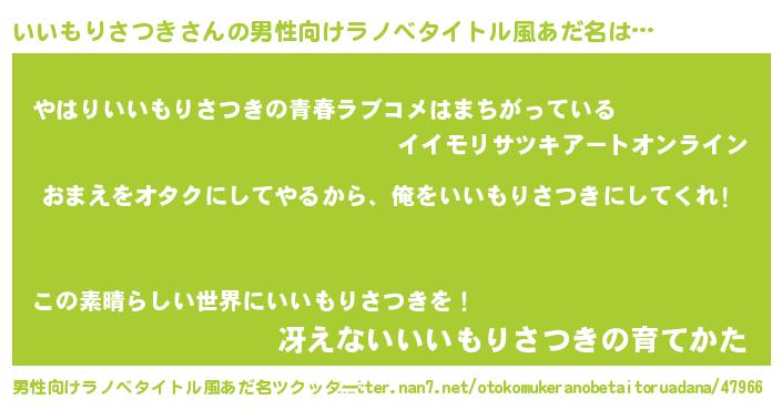 | 女子向けラノベタイトル風あだ名 | 『いいもりさつき夫妻のなれそめ』 |