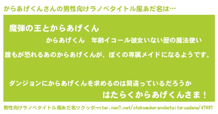 | 女子向けラノベタイトル風あだ名 | 『からあげくんの契約王妃』 |