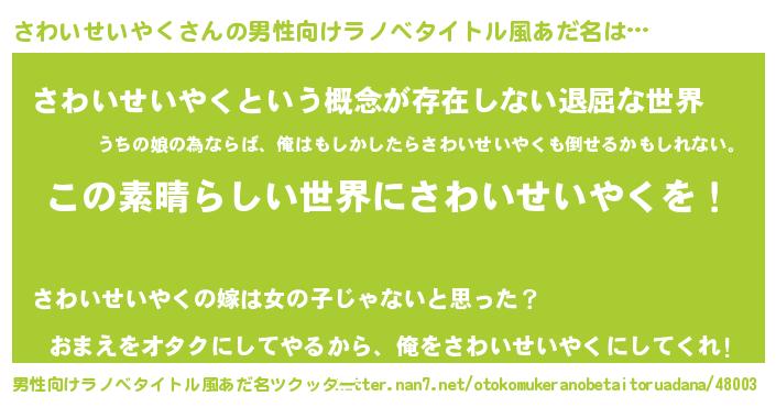 | 胡散臭い通販商品みたいなあだ名 | 『あなたにだけ特別に提供する世界で10本だけ現存している希少なブランデー…その名も「さわいせいやく」』 |