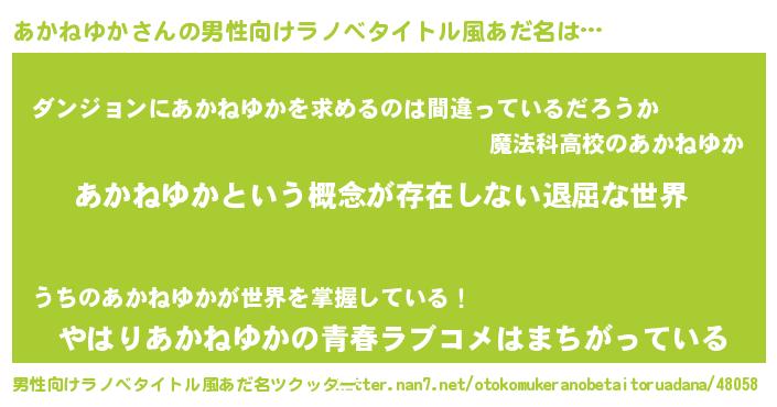 | 胡散臭い通販商品みたいなあだ名 | 『来世でも幸せになれる健康食品…その名も「あかねゆか」』 |