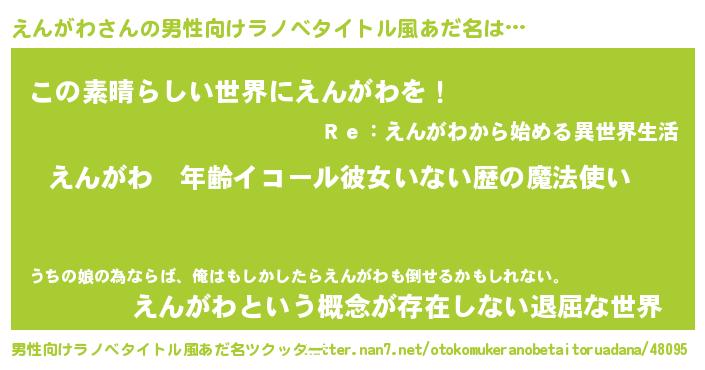 | 女子向けラノベタイトル風あだ名 | 『えんがわの玉の輿計画!』 |