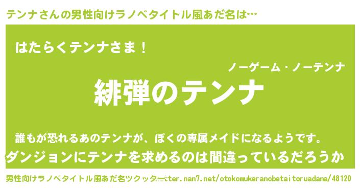 | 胡散臭い通販商品みたいなあだ名 | 『信頼と実績のサプリメント…その名も「テンナ」』 |