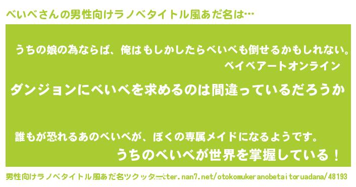 | 女子向けラノベタイトル風あだ名 | 『べいべの卵を拾いまして』 |