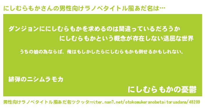 女子向けラノベタイトル風あだ名 | 『にしむらもか伯爵の花嫁』 |