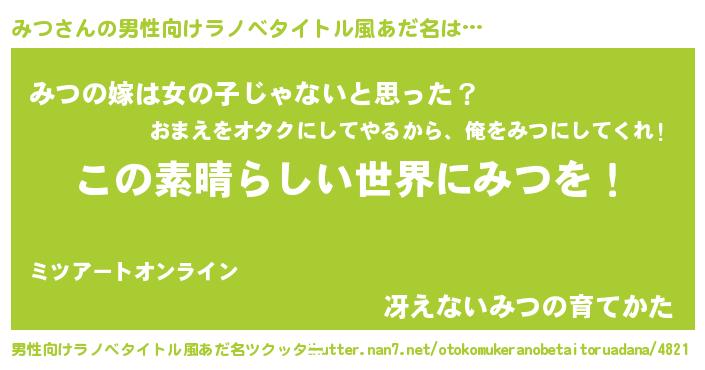 | 胡散臭い通販商品みたいなあだ名 | 『あなたにだけ特別に提供する限定10本のレアな日本酒…その名も「みつ」』 |