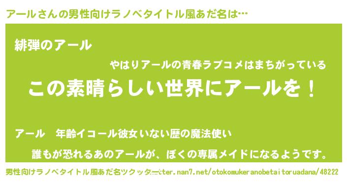 | 胡散臭い通販商品みたいなあだ名 | 『あなたにだけ特別に提供する100年もののヴィンテージワイン…その名も「アール」』 |