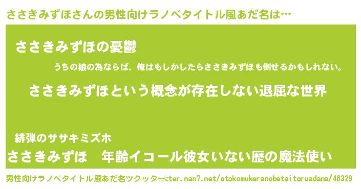 | ヘコむあだ名 | 『ささきみずほ(小並感)』『ささもー』 |