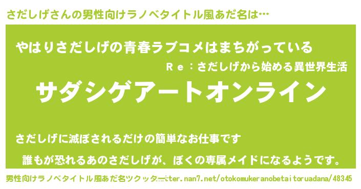 | 女子向けラノベタイトル風あだ名 | 『誰かこのさだしげを説明してください! ~契約から始まるウェディング~』 |
