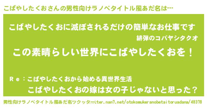 | 女子向けラノベタイトル風あだ名 | 『悪役こばやしたくおに転生したようですが、知った事ではありません』 |