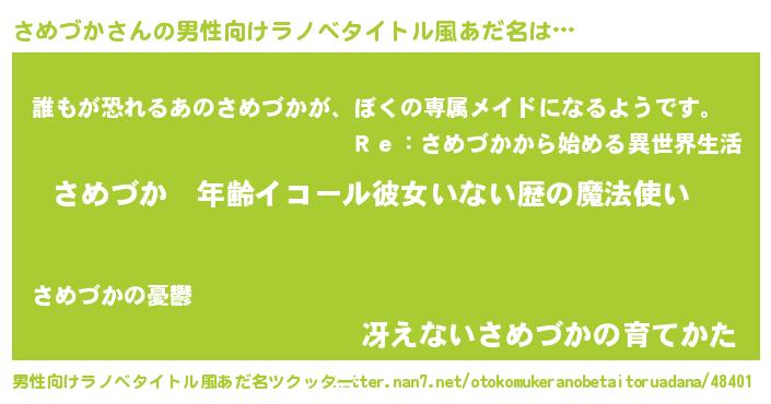 | 女子向けラノベタイトル風あだ名 | 『さめづかの玉の輿計画!』 |
