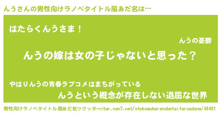 | 女子向けラノベタイトル風あだ名 | 『んうの卵を拾いまして』 |