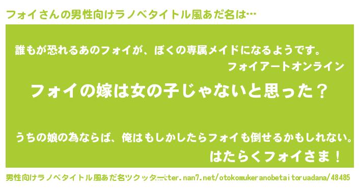 | 女子向けラノベタイトル風あだ名 | 『フォイの卵を拾いまして』 |