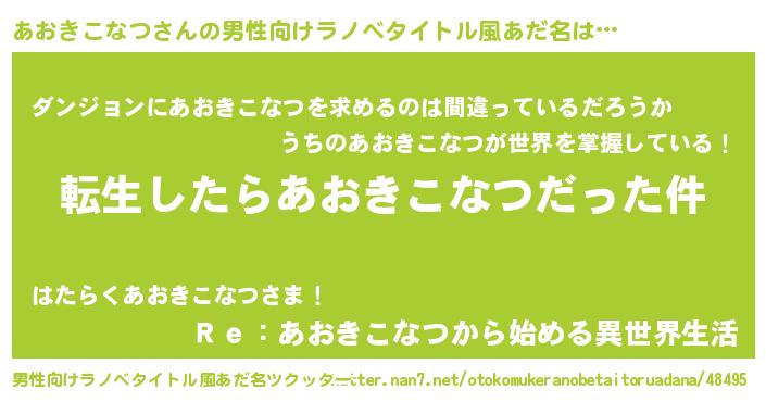 | 女子向けラノベタイトル風あだ名 | 『あおきこなつの玉の輿計画!』 |