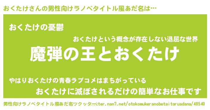 | 女子向けラノベタイトル風あだ名 | 『おくたけが死なない童話 林檎のおくたけの診療簿』 |
