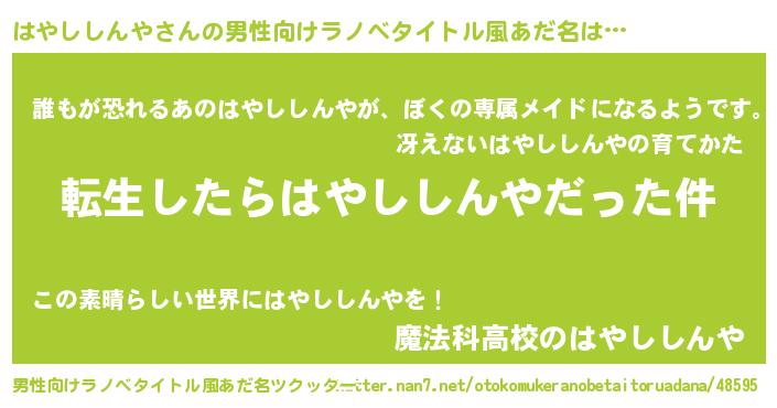 | 胡散臭い通販商品みたいなあだ名 | 『来世でも幸せになれる水素水…その名も「はやししんや」』 |